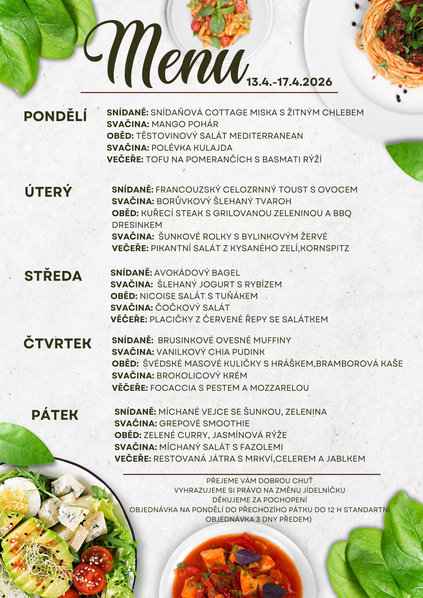 hlavní chod, malá polévka, odpolední svačina